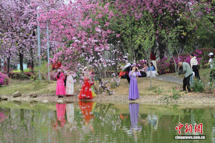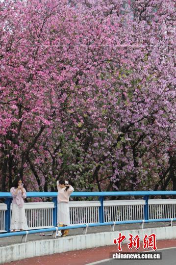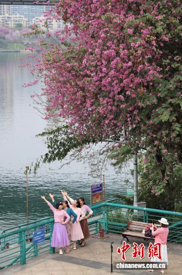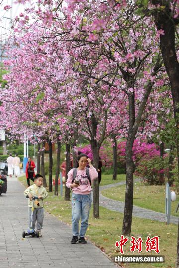 图为市平易近正在柳州市不雅光道赏花摄影。郑昌昊 摄