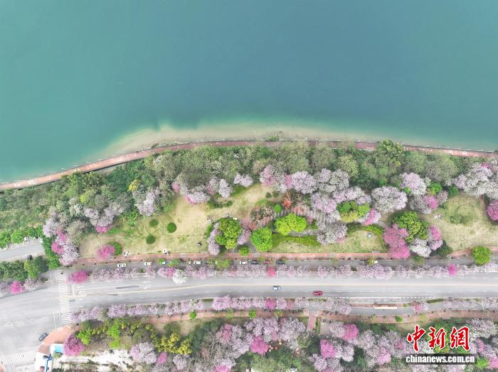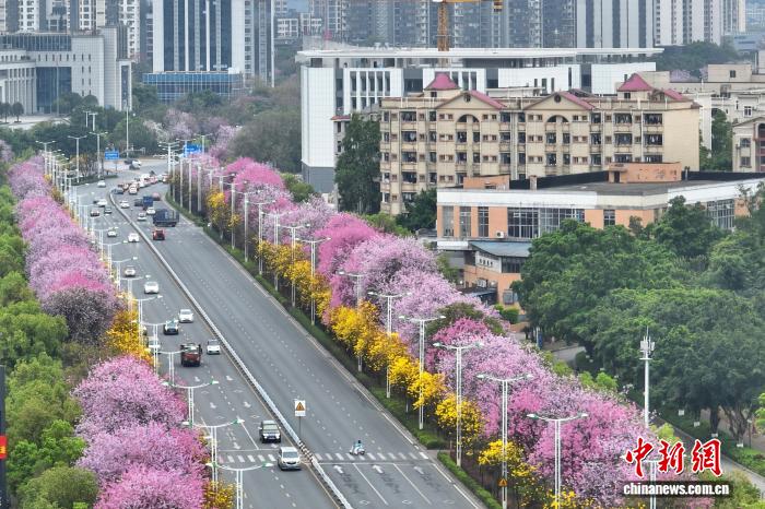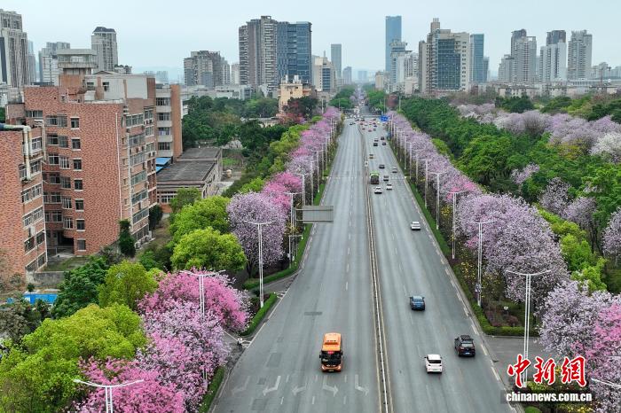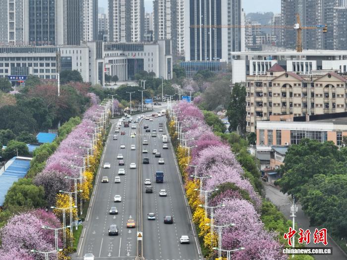 图为车辆正在洋紫荆怒放的柳州市环滨火年夜谈下行驶。(无人机相片)郑昌昊 摄